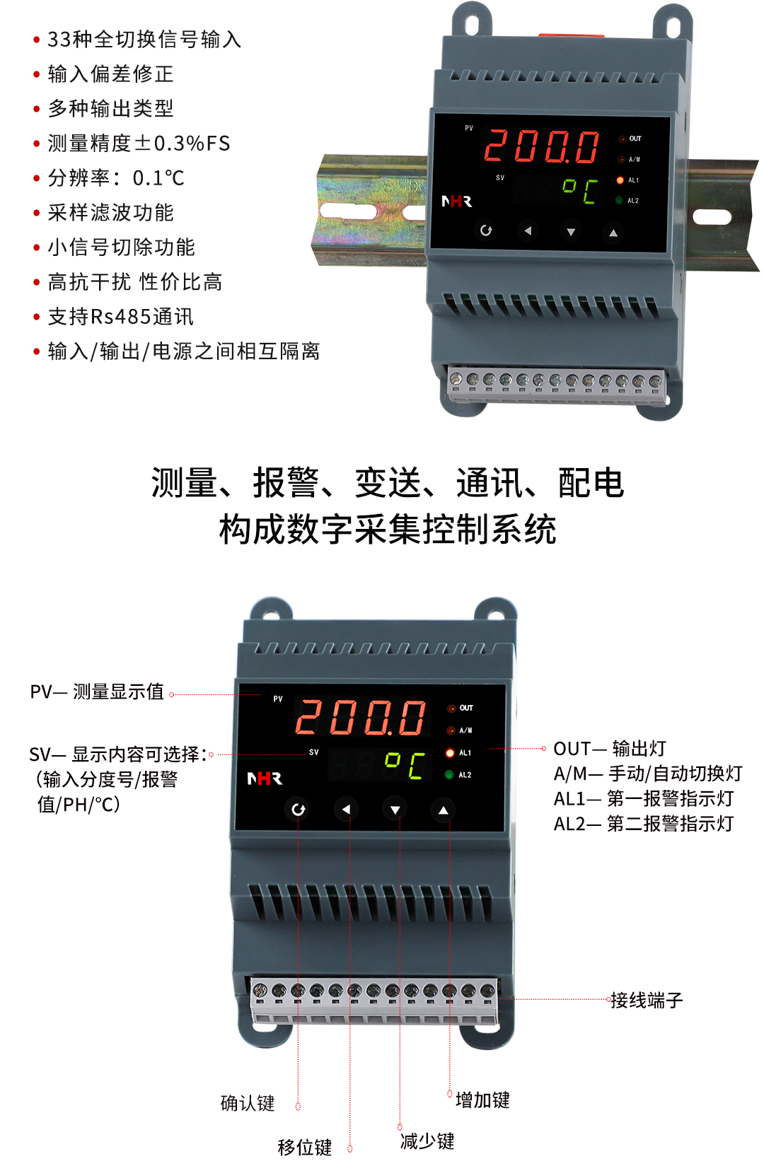 虹潤公司是專業(yè)生產數顯表的國家專精特新“小巨人”企業(yè),生產的導軌式數顯儀表,具有全切換信號輸入,導軌壁掛共用,全隔離設計,高抗干擾,變送輸出或RS485通訊等特點。產品獲得巡回檢測顯示方法及裝置、工業(yè)模塊的導軌式安裝結構等2項國家發(fā)明專利,主持起草工業(yè)過程控制系統(tǒng)用模擬輸入兩位或多位輸出儀表、物聯網智能溫度儀表通用技術條件等2項國家標準,,以及通信系統(tǒng)多通道數據采集控制終端規(guī)范軍用標準,參與國際5G標準制定,取得簡易數顯儀表等3項相關軟件著作權。產品廣泛應用于電力、石化、冶金、化工、造紙、食品、輕工、制藥、熱處理、水處理、機械配套等各種工業(yè)現場。