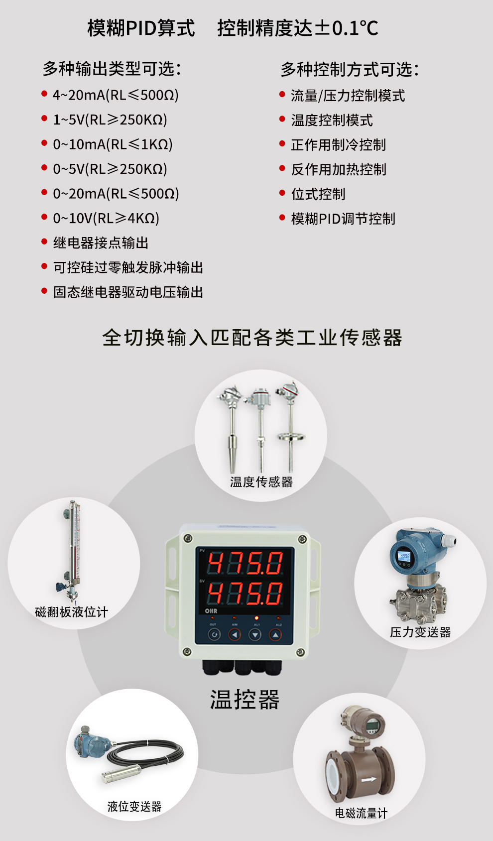 虹潤(rùn)公司是專業(yè)生產(chǎn)溫控器的國(guó)家專精特新“小巨人”企業(yè)。生產(chǎn)的壁掛式PID溫控器,具有全切換信號(hào)輸入,真正人工智能算式,控制精度達(dá)士0.1°C,防護(hù)等級(jí)高,RS485通訊輸出DN等特點(diǎn)。產(chǎn)品獲得模糊PID控制儀及控制方法、人工智能調(diào)節(jié)器、智能化控制器、移相觸發(fā)控制器、閥門自動(dòng)手動(dòng)無擾動(dòng)操作控制方法及裝置等5項(xiàng)國(guó)家發(fā)明專利,主持起草主持起草工業(yè)過程控制系統(tǒng)用模擬輸入兩位或多位輸出儀表、物聯(lián)網(wǎng)智能溫度儀表通用技術(shù)條件、工業(yè)過程測(cè)量和控制系統(tǒng)用智能調(diào)節(jié)器等3項(xiàng)國(guó)家標(biāo)準(zhǔn),以及通信系統(tǒng)多通道數(shù)據(jù)采集控制終端規(guī)范軍用標(biāo)準(zhǔn)。參與國(guó)際5G標(biāo)準(zhǔn)制定,取得傻瓜式PID調(diào)節(jié)儀等3項(xiàng)相關(guān)軟件著作權(quán)。產(chǎn)品廣泛應(yīng)用于電力、石化,冶金、制藥、食品等幾乎所有工業(yè)現(xiàn)場(chǎng),實(shí)現(xiàn)精準(zhǔn)控溫,保障生產(chǎn)安全與質(zhì)量。