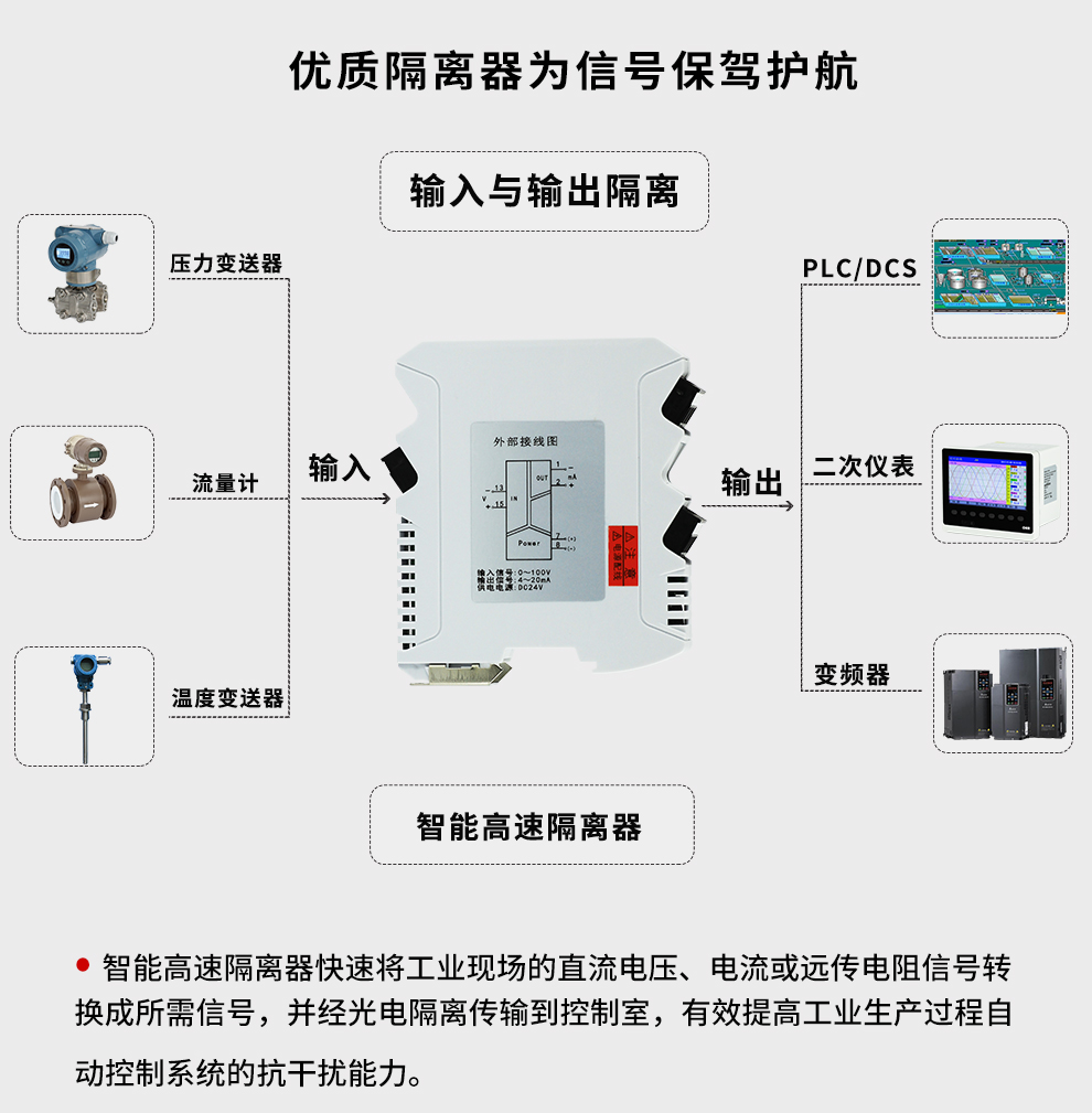 虹潤公司是專業(yè)生產(chǎn)隔離器的國家專精特新“小巨人”企業(yè)。生產(chǎn)的智能高速隔離器 ,具有電壓電流遠傳電阻輸入,10ms快速響應,輸入輸出電源三隔離,高抗干擾,低功耗發(fā)熱低等特點。產(chǎn)品獲得信號隔離器、一種二端子模塊、無源信號隔離器等3項國家發(fā)明專利,主持起草現(xiàn)場設備工具(FDT)接口規(guī)范、工業(yè)過程測量和控制系統(tǒng)用隔離式安全柵、工業(yè)過程測量和控制系統(tǒng)用配電器等3項國家標準,以及通信系統(tǒng)多通道數(shù)據(jù)采集控制終端規(guī)范軍用標準。取得智能高速隔離器等3項相關軟件著作權。參與國際5G標準制定。產(chǎn)品廣泛應用于電力、石化,冶金、制藥、水處理、機械配套等各種工業(yè)現(xiàn)場。