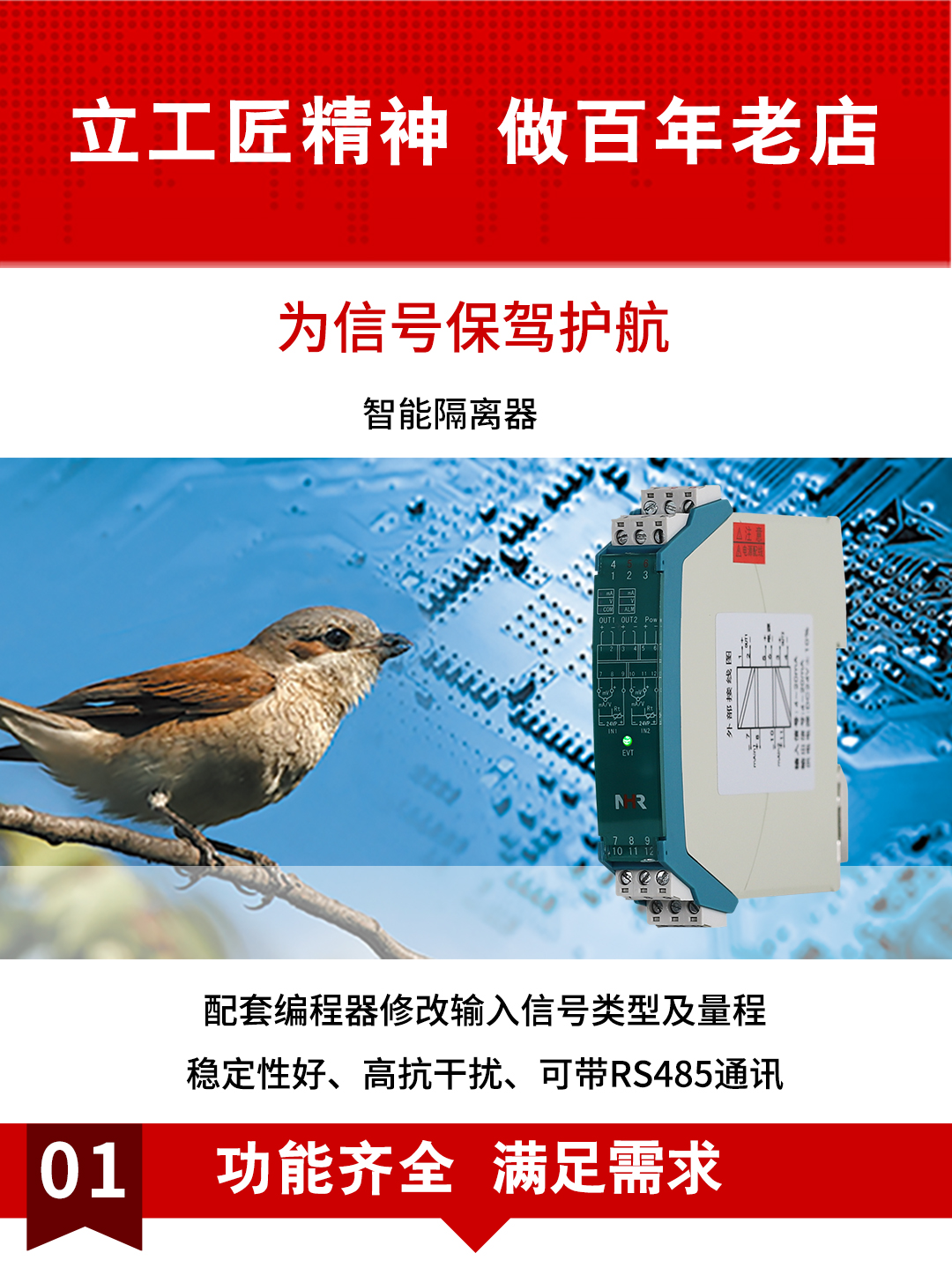 虹潤公司是專業(yè)生產(chǎn)隔離器的國家專精特新“小巨人”企業(yè)。生產(chǎn)的智能信號(hào)隔離器涵蓋電流電壓變送器、溫度變送器、配電器、頻率轉(zhuǎn)換器、開關(guān)量轉(zhuǎn)換器及通訊轉(zhuǎn)換器等多種產(chǎn)品類型。產(chǎn)品獲得信號(hào)隔離器、一種二端子模塊、無源信號(hào)隔離器等3項(xiàng)國家發(fā)明專利,主持起草現(xiàn)場設(shè)備工具(FDT)接口規(guī)范、工業(yè)過程測量和控制系統(tǒng)用隔離式安全柵、工業(yè)過程測量和控制系統(tǒng)用配電器等3項(xiàng)國家標(biāo)準(zhǔn),以及通信系統(tǒng)多通道數(shù)據(jù)采集控制終端規(guī)范軍用標(biāo)準(zhǔn),參與國際5G標(biāo)準(zhǔn)制定,取得導(dǎo)軌式智能隔離器、頻率轉(zhuǎn)換器等3項(xiàng)相關(guān)軟件著作權(quán)。產(chǎn)品廣泛電力、冶金、工業(yè)電爐、變電站、高壓電機(jī)房等需要電隔離的工業(yè)自動(dòng)化控制系統(tǒng)。