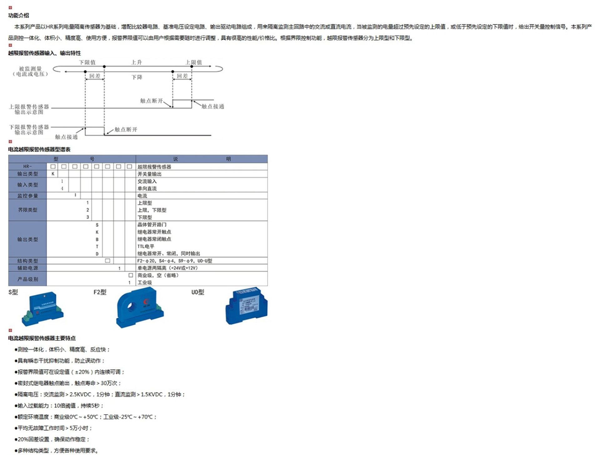 電流越限報警傳感器以HR系列電量隔離傳感器為基礎(chǔ),增配比較器電路、基準(zhǔn)電壓設(shè)定電路、輸出驅(qū)動電路組成,用來隔離監(jiān)測主回路中的交流或直流電流,當(dāng)被監(jiān)測的電量超過預(yù)先設(shè)定的上限值,或低于預(yù)先設(shè)定的下限值時,給出開關(guān)量控制信號。